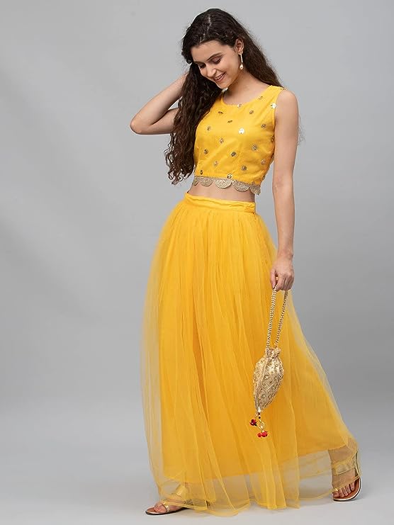 studio rasa Net Sequin Embroidered Crop Top (TPWC22129_Yellow)